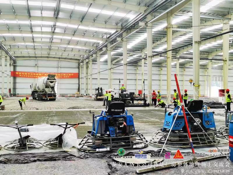 本次活动得到了业主方尤洛卡矿业安全工程股份有限公司的大力支持: 位于山东省泰安市的尤洛卡新建厂房地坪项目总面积约为18,000平方米。项目基层采用强夯方式压实,三七灰土,基层上方浇筑10公分厚C30混凝土垫层,铺设双层0.15mm PE薄膜,并在薄膜上方架设6#单层双向钢筋网。项目整体混凝土浇筑采用朔马珞S-15R混凝土激光整平机摊铺20公分厚C30混凝土,并在混凝土中加入Sika 8060钢纤维,掺量为20kg/m3。耐磨面层采用朔马珞S-11M撒料机布撒5公斤/m2 Sika 2-1耐磨骨料。随后对地坪作业面进行收光、固化和养护等一体化作业,并使用西卡931 Finishing Aid产品。收光设备为上海杰工双盘抹光机等一系列收光设备和施工工具。
